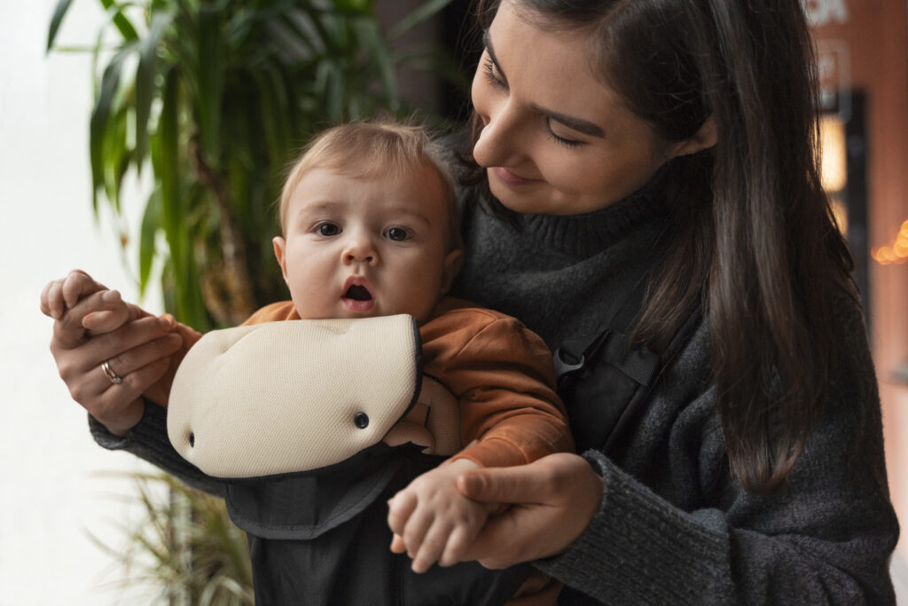 Usar um canguru ajuda a manter o bebê próximo, reduz cólicas e facilita a realização de tarefas diárias.